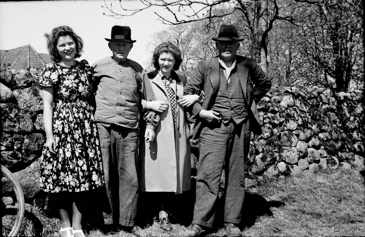 Två kvinnor och två äldre män står i armkrok i solskenet vid en hög stengärdsgård. I bakgrunden ses tegeltaket till ett hus med utbyggnad.