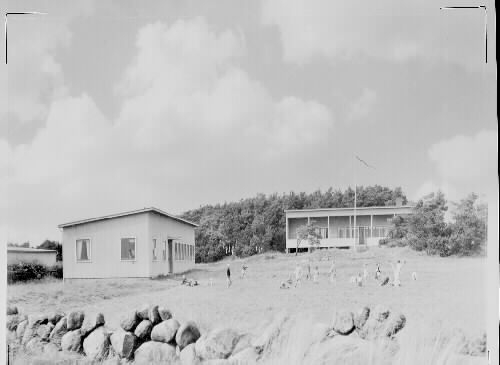 Vy över Falköpings barnkoloni i Gamla Köpstad söder om Varberg. Några personer befinner sig på ängen framför byggnaderna.