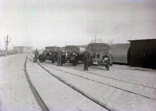Tankbilar för eldningsolja etc hos Donald Jobson. Chaufförerna står uppställda vid sina lastbilar. Bild 1: Byggnaden t v är rodd- och kanotklubbens klubbstuga.