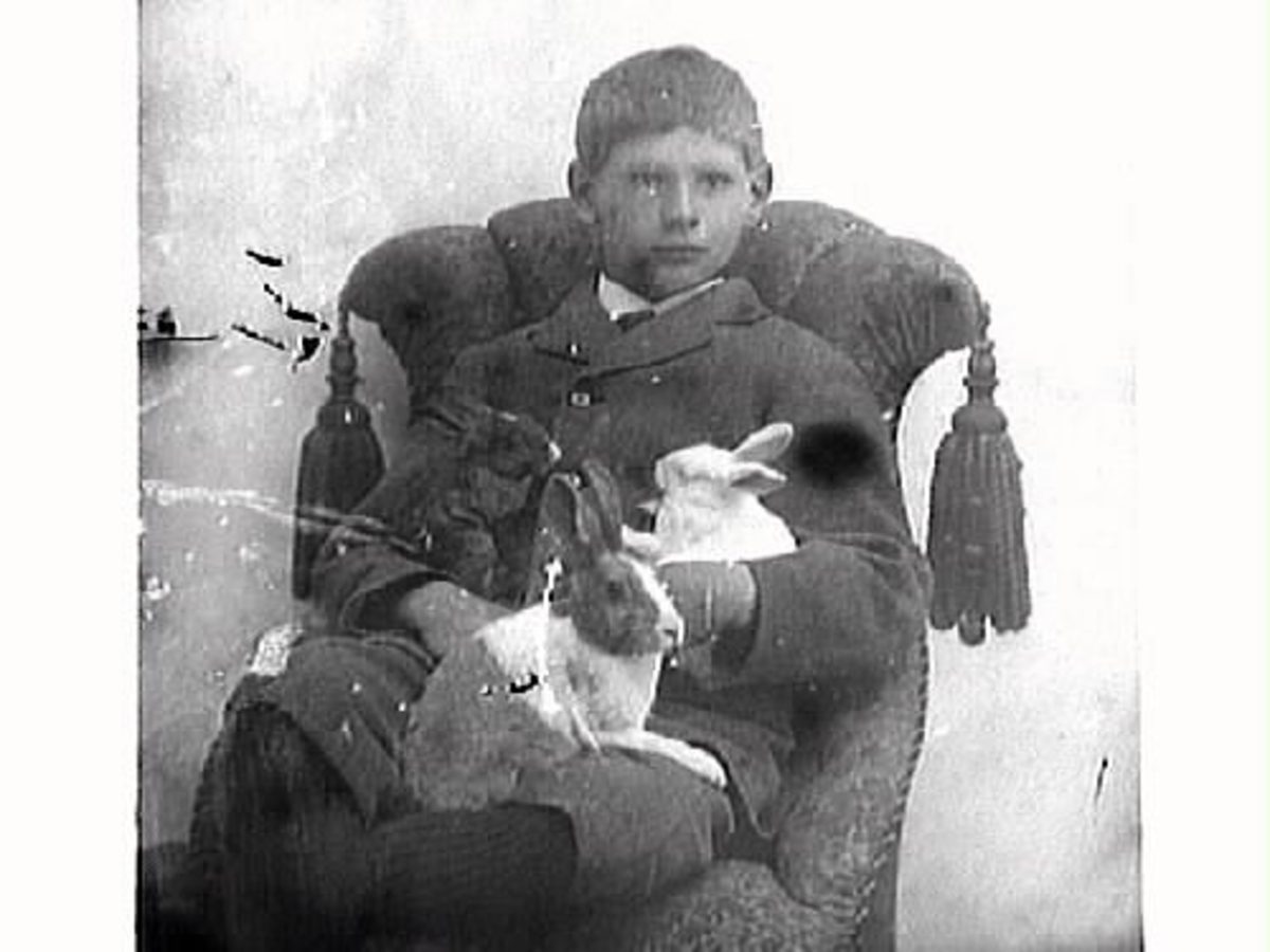 Pojkporträtt. Erik Ranch med tre kaniner. Barnporträtt.