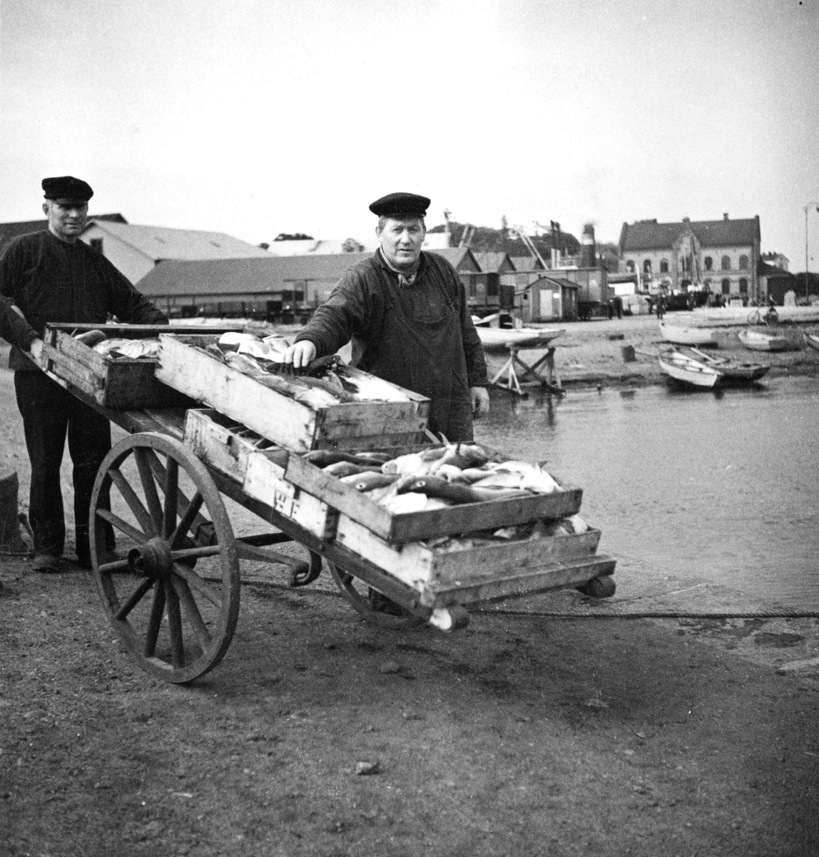 Två män med fiskvagn i Varbergs hamn. I bakgrunden ses tullhuset, magasin och båtar uppdragna på stranden.