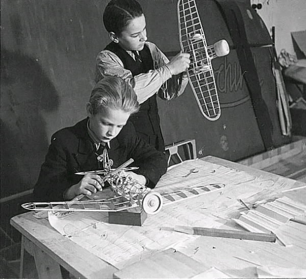 Två pojkar håller på med modellbygge av flygplan. Tillhör samlingen med fotokopior från Hallands Nyheter som är från 1930-1940-talen.
