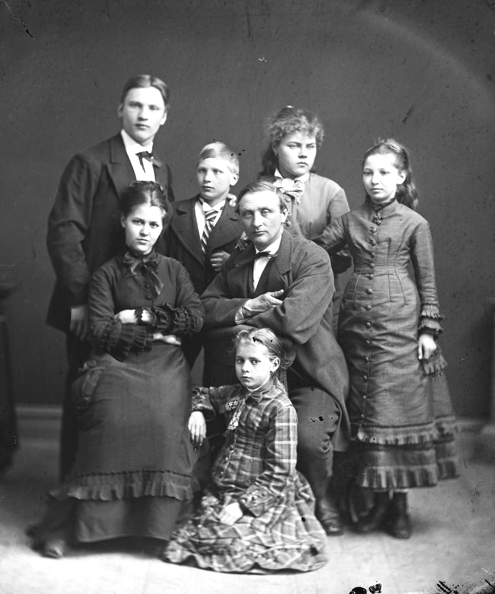 Ateljéfoto. Wilhelm Ranch sittande i mitten med sex av sina barn omkring sig: stående från vänster Djonn Ranch, Wilhelm Ranch, Agnes Bergqvist, Hulda Ranch (gift Lindh). Sittande: Mathilda Ranch, Wilhelm Ranch, Nathalia Ranch. Fadern grundade sin fotoateljé i Varberg 1872 och Mathilda övertog den 1882.