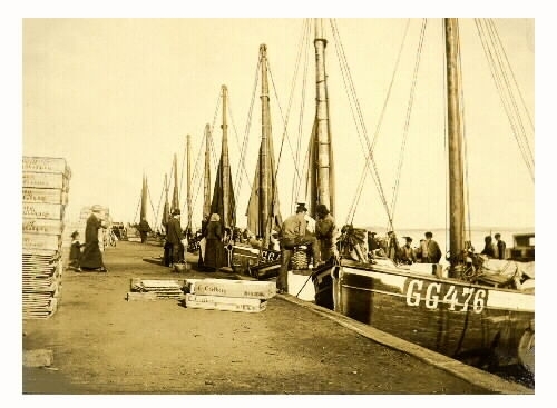 Antecknat på bildens baksida: "Bild från Varbergs hamn under sillsäsongen på hösten." Sillfiskebåtar vid kaj i Varbergs hamn, där folk kommer och handlar direkt av fiskarna. Packlådorna vid kajkanten är märkta "E. Carlberg Warberg".