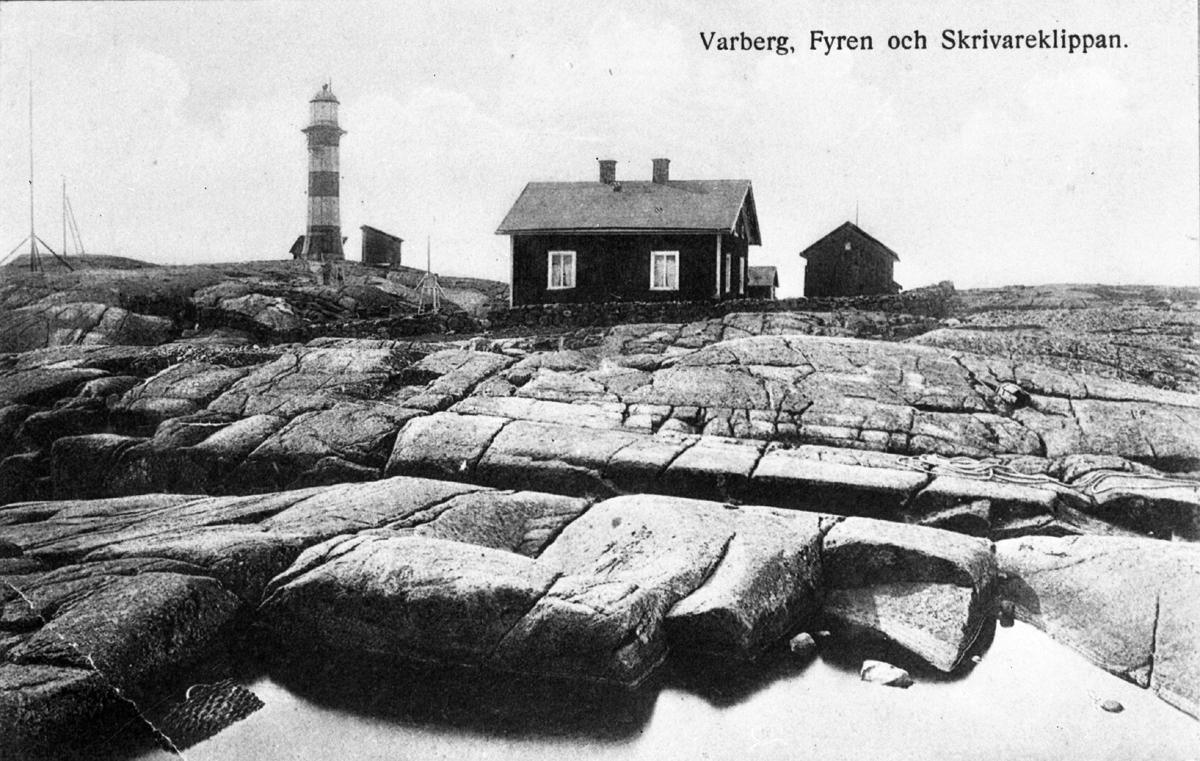 Vykort, "Varberg. Fyren och Skrivareklippan" och fyrvaktarbostaden. Förlag: Karl Janssons Tryckeri- och Pappershandel.