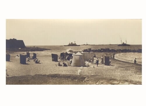 Vykort "Varbergs havsbad". Barnens badstrand med två krigsfartyg på redden, troligen under 1:a världskriget. Randiga tält och andra små hytter. Havs- och strandvy.