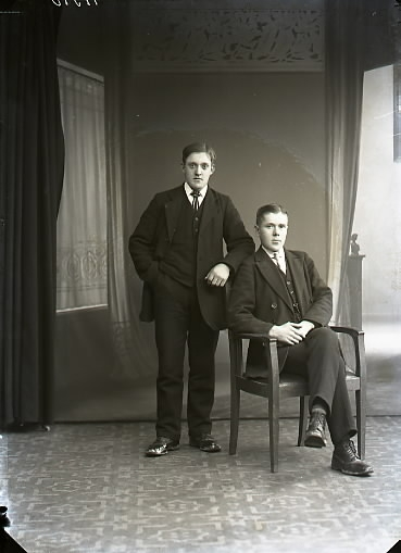 Ateljébild av två unga män. Beställare: John Andrén. Källstorp nr 8, Backa.