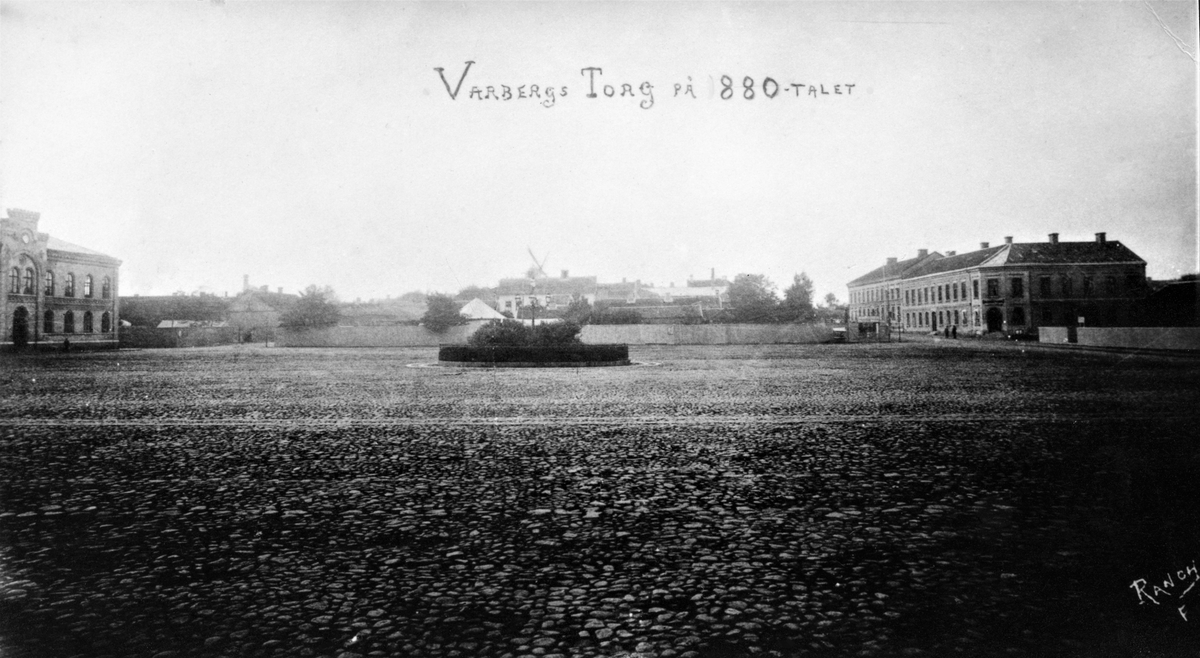 Fotografi av Varbergs torg på 1880-talet mot Bäckgatan i söder, innan återuppbyggnaden efter branden 1863. Det stora ödsliga torget är belagt med kullersten och pryds av en rund staketförsedd plantering, kallad Brännvinsringen och tillkommen 1883. Till vänster ses Rådhuset vid Drottninggatan och till höger ligger bostadshusen i kv Gästgivaren vid Kungsgatan. Konstnären Richard Bergh (Konstnärskolonin Varbergsskolan) bodde där på Kungsgatan 28 med sin familj på 1890-talet. Bakom det långa planket längs de avbrunna tomterna ses ett tält sticka upp. Resande teatersällskap och cirkusar lär ha fått använda platsen för sina föreställningar.