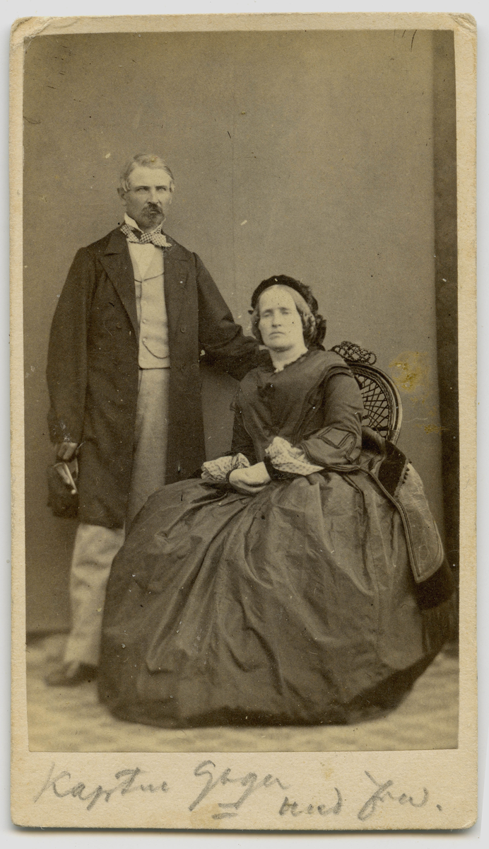 Titel: Porträtt på Kapten Gustaf Fredrik Planting- Gyllenbåge med fru. Född 15 maj år 1819 på Lilla Gavlö Dannäs socken. Död 7 augusti år 1913 på Väboholm Reftele socken. Kommissionslantmätare, regementsskrivare Ägde Väboholm.