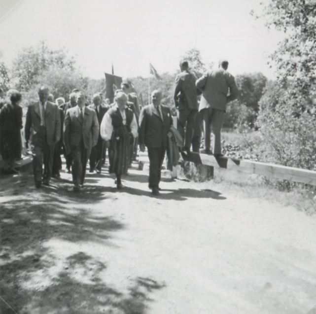 En samlad grupp, från SLU eller Bondeförbundet, går på en grusväg, Backen eller Högen okänt årtal. Någon håller en fana i luften.