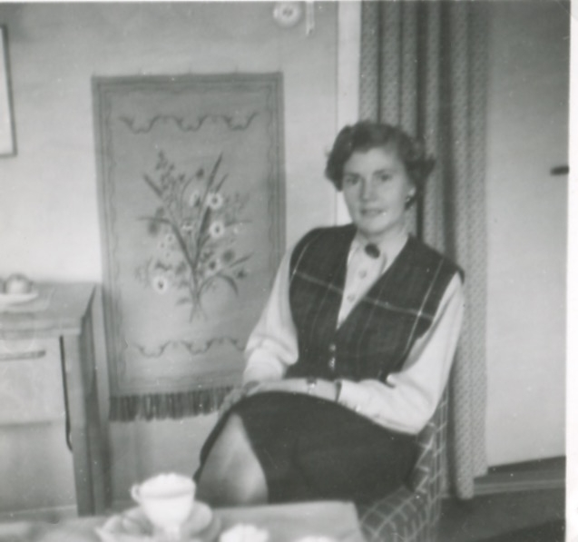 En kvinna sitter på en stol i ett rum, Backen eller Högen 1960-tal. Snett bakom henne hänger en bonad på väggen. Namnuppgift saknas.