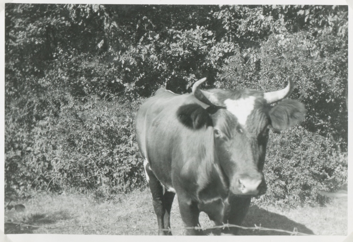 En ko står på en gräsmatta bakom en taggtråd, Backen eller Högen 1960-tal. Kon tittar på fotografen.