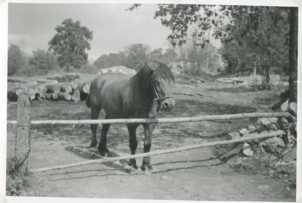 En arbetshäst står vid ett par nedlagda slanor som fungerar som grind, Backen eller Högen 1960-tal. I bakgrunden ses nedsågat virke, träd och gräsmattor.