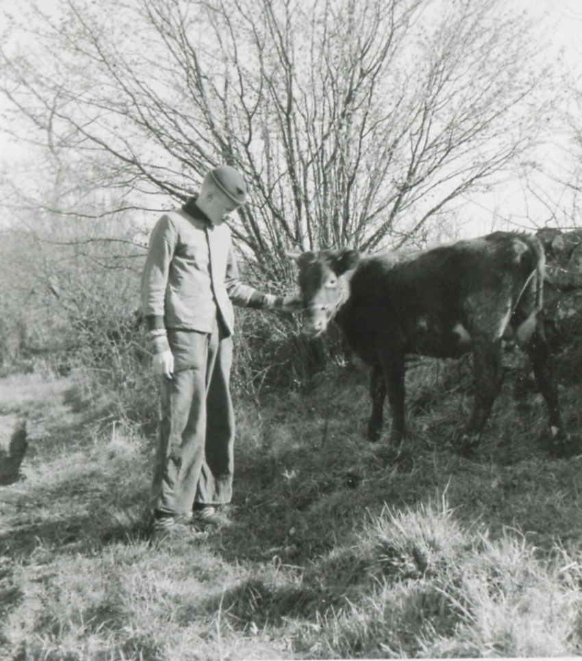 En ung man/pojke står och håller en grimma som sitter på en ko, Backen eller Högen 1960-tal.