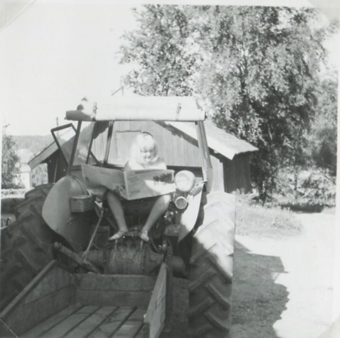 Ett barn sitter baktill på en traktor och läser tidningen, Backen eller Högen (nedre gården) 1960-tal. I bakgrunden skymtas en ekonomibyggnad.