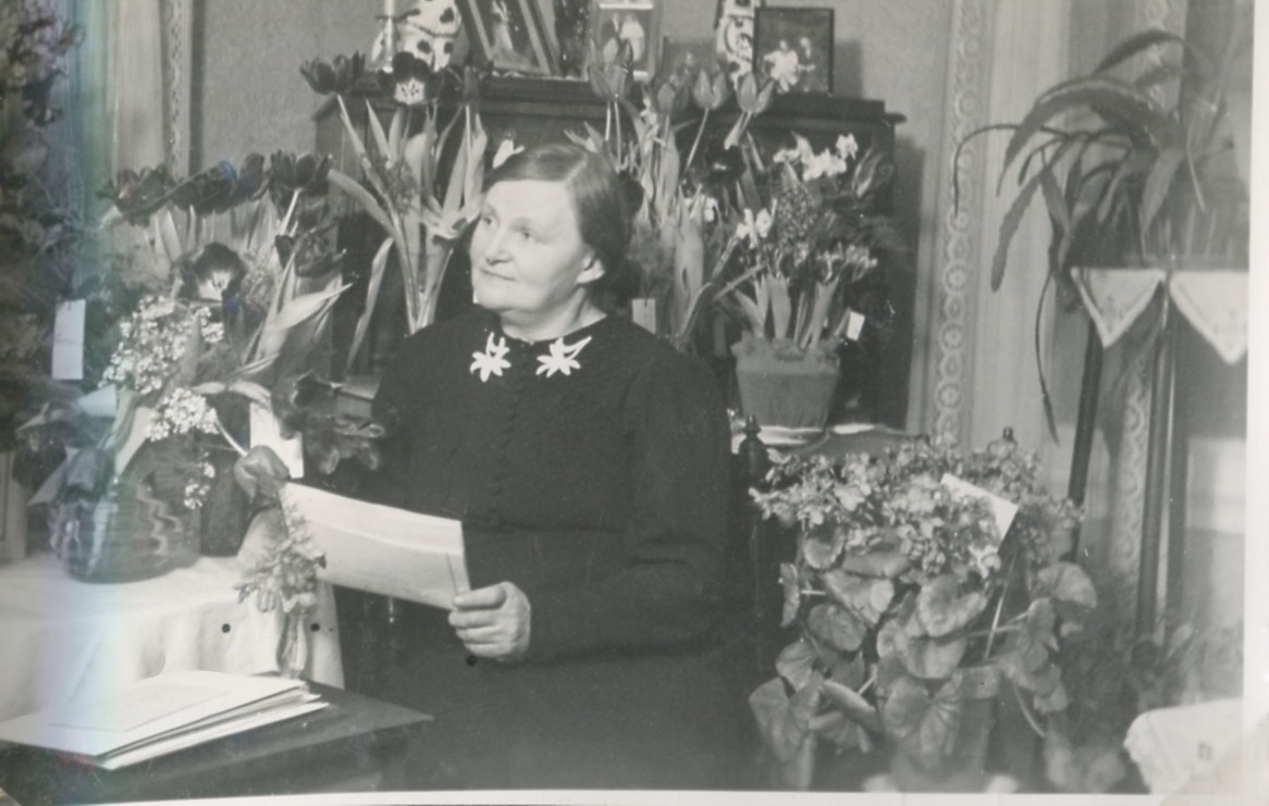 Svea* Gudviva Fredrika Johansson(1892 - 1976) sitter omgiven av blommor. Hon håller ett papper i handen, Heljered Västergård "Brors", okänt årtal. Svea var söndagsskolärare i Missionsförsamlingen.
