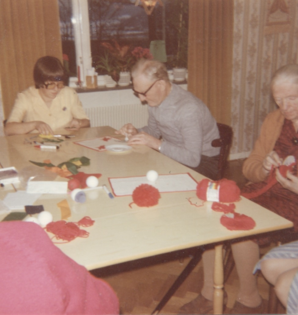 Terapi för de boende och personal (namnuppgifter saknas) i Brattåshemmets matsal 1970-tal.