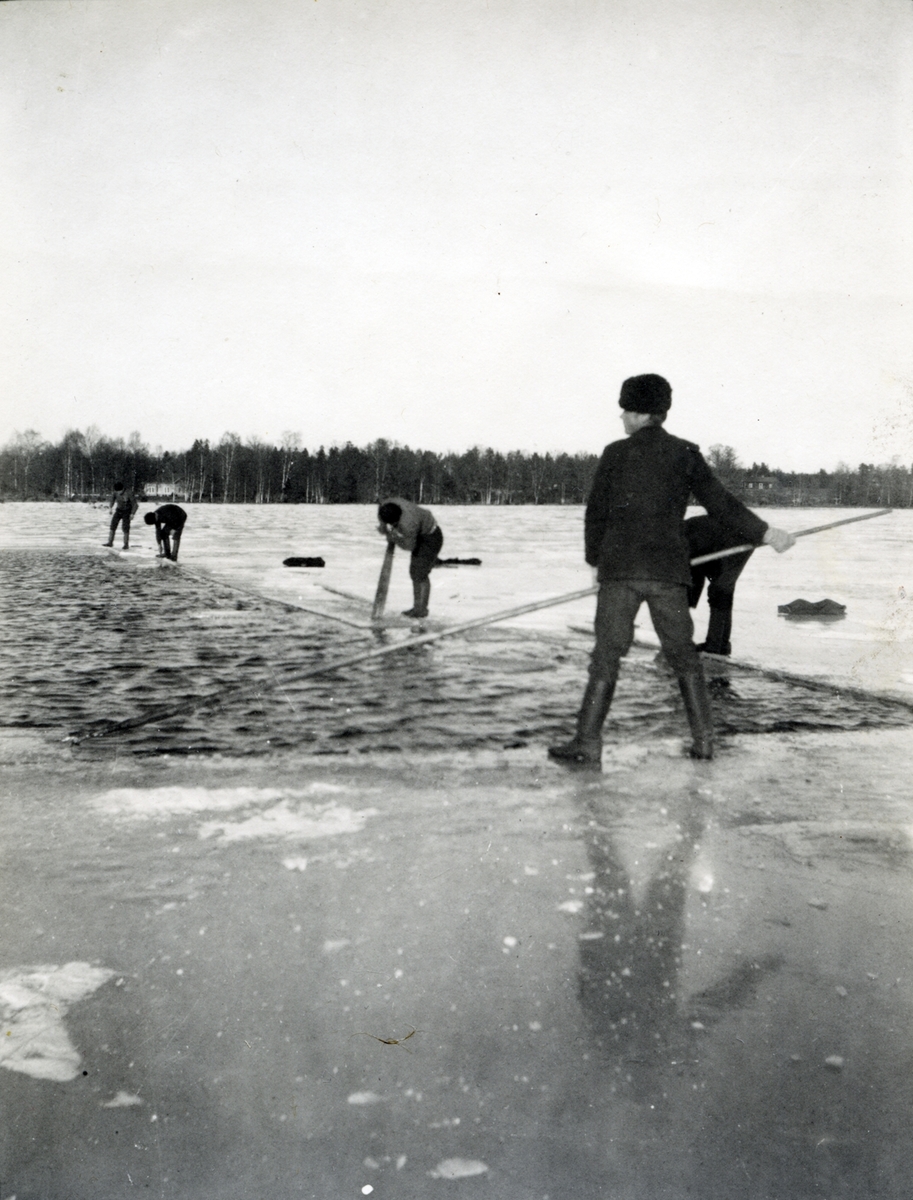 Folk som hämtar isblock i Tunasjön närheten av Tuna gård. Det lades upp ett lager av is mellan mejeriet och matboden. Isen täcktes med sågspån och där hämtades is för hushållsbehov.