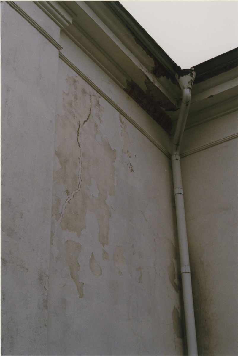 Dalhems kyrka, putsad fasad med hängränna. Foto från renoveringen 1993.