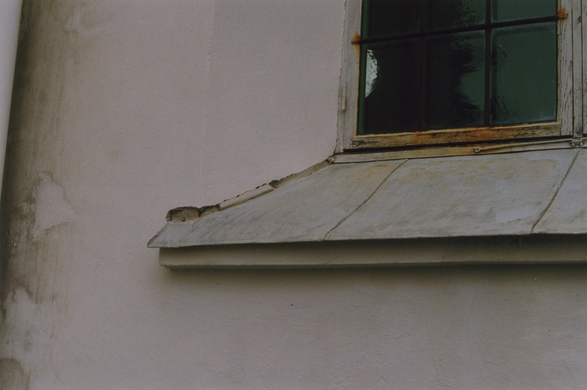 Dalhems kyrka, putsad fasad med fönster och avrinningsplåt. Foto från renoveringen 1993.