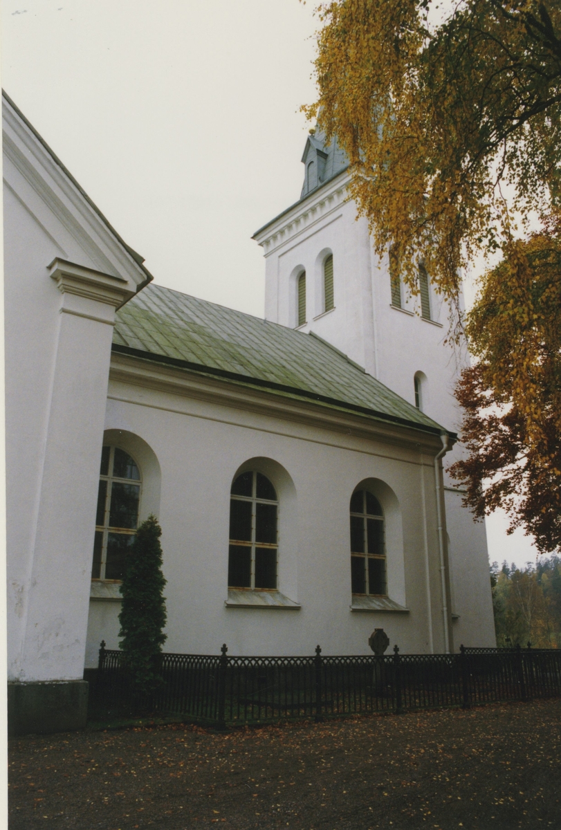 Dalhems kyrka, putsad fasad, valvfönster och kyrkogård. Foto från renoveringen 1993.