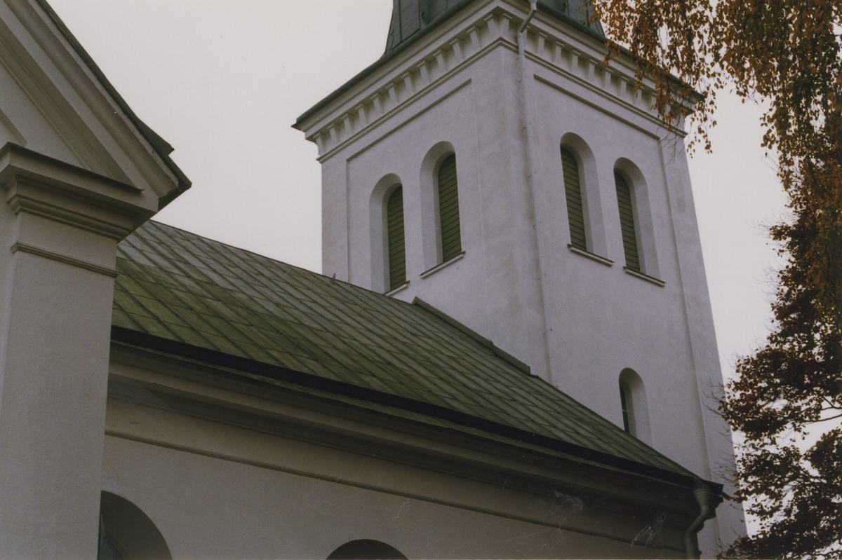 Dalhems kyrka, putsad fasad, kyrktorn och vapenhus. Foto från renoveringen 1993.