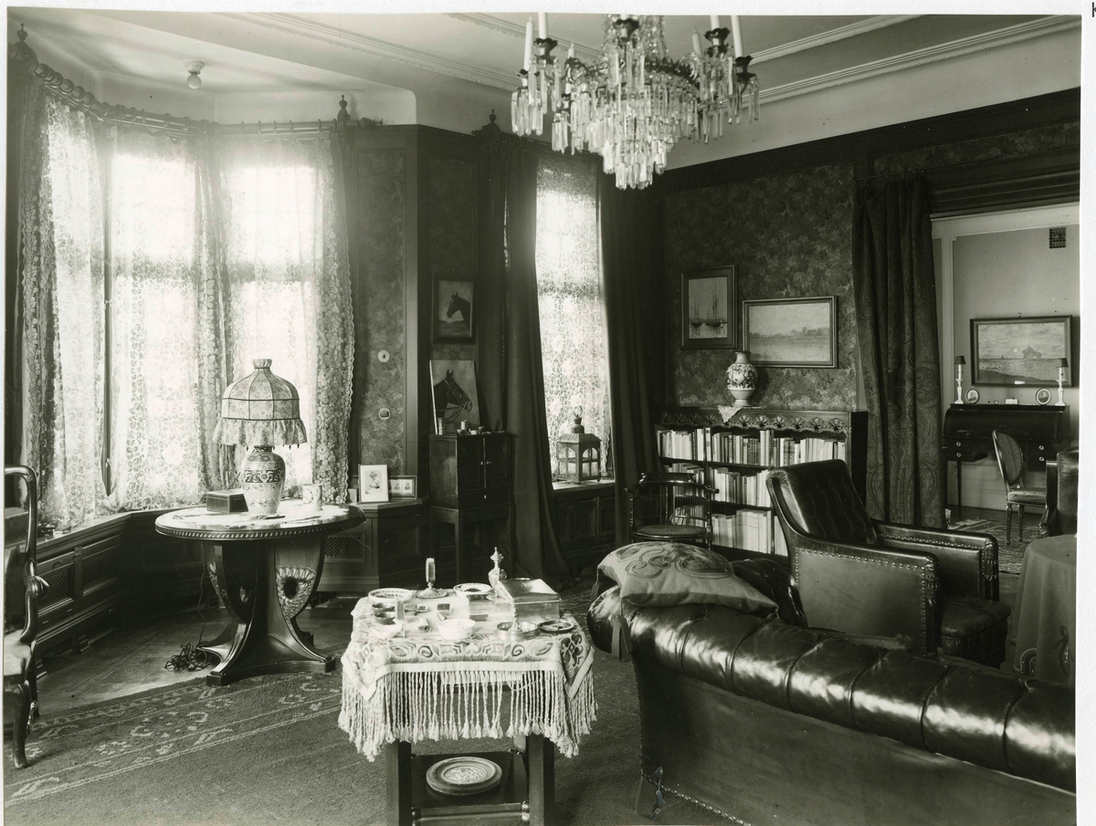 Salong på Bergagården med fåtölj, soffa, bord, bokhylla och kristallkrona.