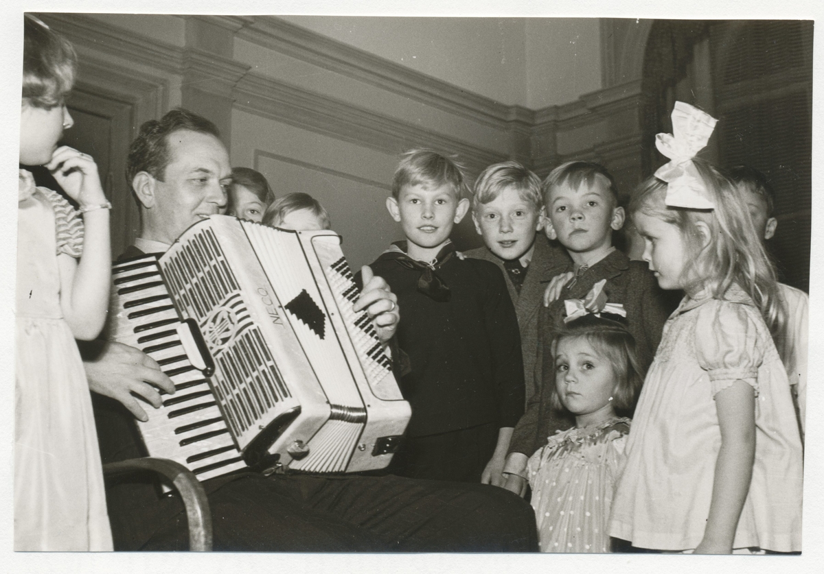 Amatörtävlling i Folkets park, barn tillsammans med dragspelare.