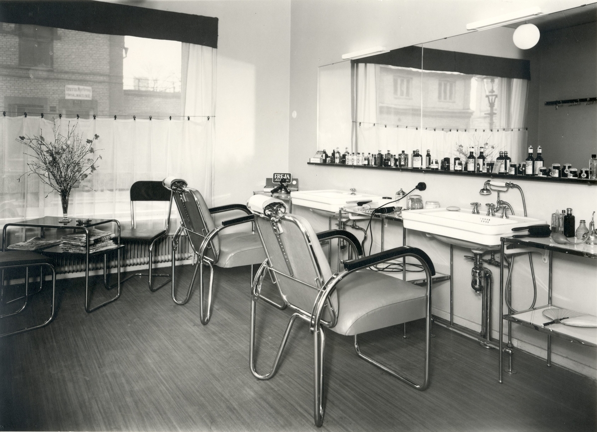 Interiör från en frisersalong för herrar på Smålandsgatan. Fastigheten färdigbyggd cirka 1935.