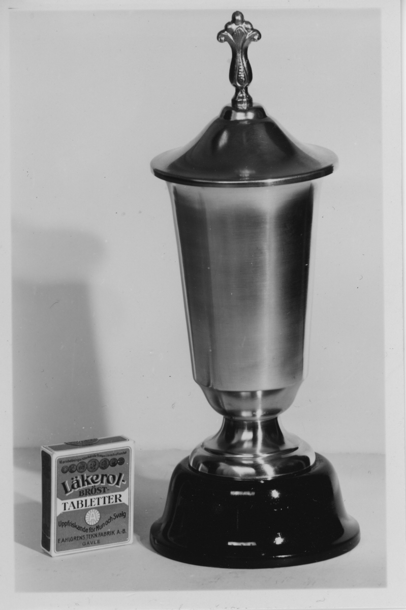 Silverpokal. Läkerolask ståendes tv om pokalen.