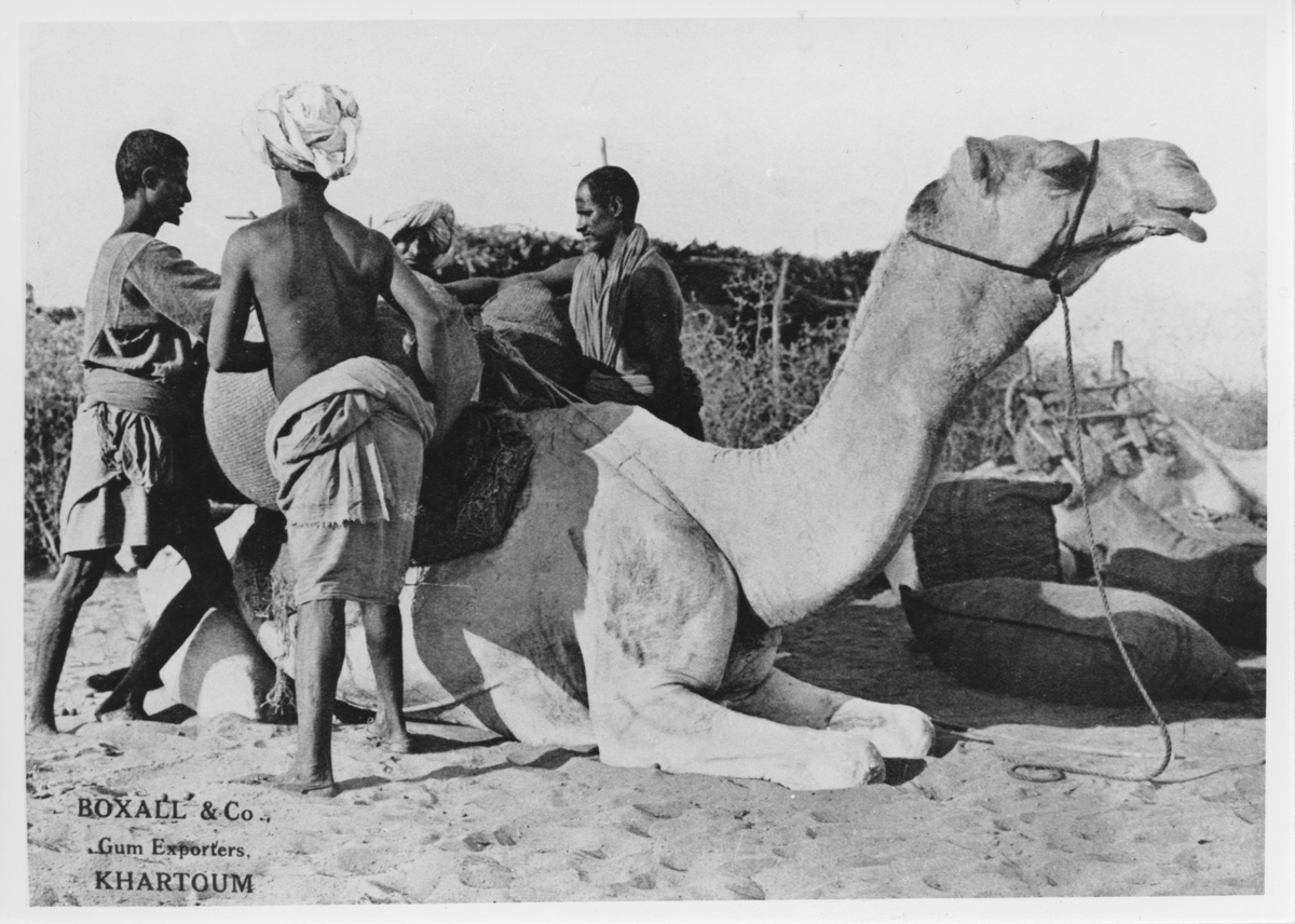 Lastning av gummi arabicum på liggande kamel. Troligtvis i Sudan.