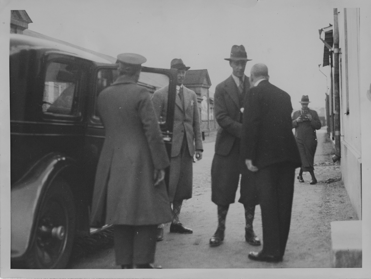 Prins Gustaf Adolf på besök vid Läkerolfabriken A.B Pastill på Brunngatan 1 Gefle 10:e oktober 1933. Direktör Adolf Ahlgren hälsar prinsen välkommen. Till höger om prinsen ses Major Åge Lundström.