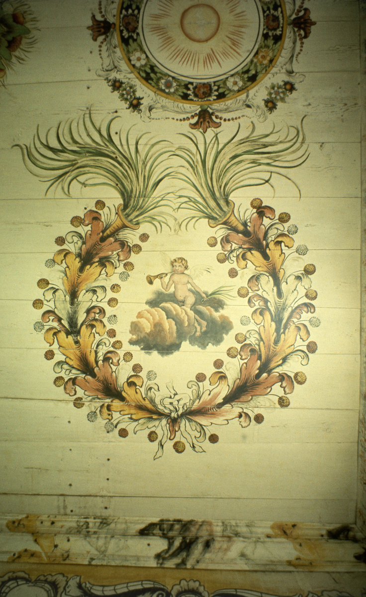 Takmålning. Ängel blåsandes i trumpet på ett moln i mitt, eklövskrans omkring.