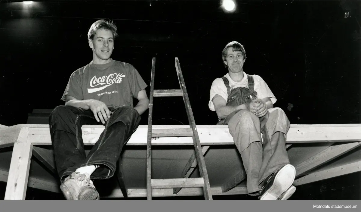 Två okända män sitter på en träbalk med en stege emellan dem, gamla Teaterhuset (före detta Missionskyrkan), okänt årtal.