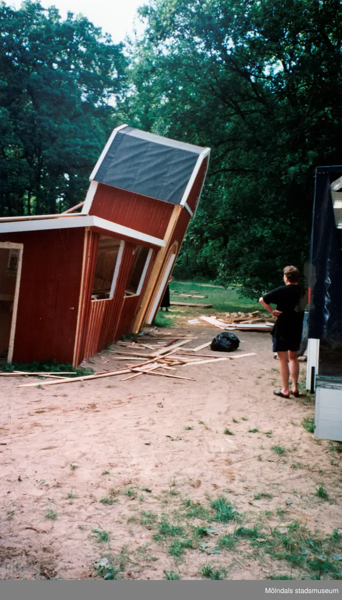 Sommarspelet/barnteaterföreställningen "Rasmus på luffen" 1999 vid Byxorna i Gunneboskogen (korsningen Christina Halls väg/John Halls väg). En sned byggnad, troligtvis föreställningens kiosk, monteras ned.