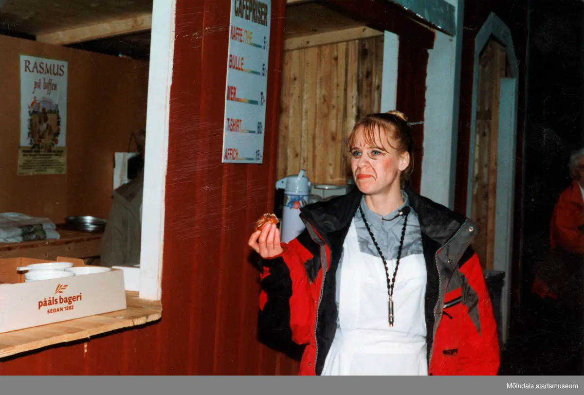 Sommarspelet/barnteaterföreställningen "Rasmus på luffen" 1999 vid Byxorna i Gunneboskogen (korsningen Christina Halls väg/John Halls väg). En skådespelerska står utanför kiosken och äter en bulle.
