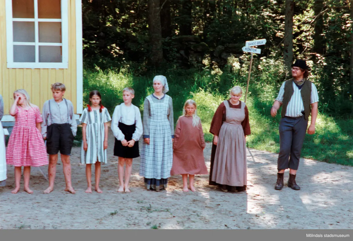 Sommarspelet/barnteaterföreställningen "Rasmus på luffen" 1999 vid Byxorna i Gunneboskogen (korsningen Christina Halls väg/John Halls väg). Skådespelare (både barn och vuxna) står på en rad för att ta emot publikens applåder.