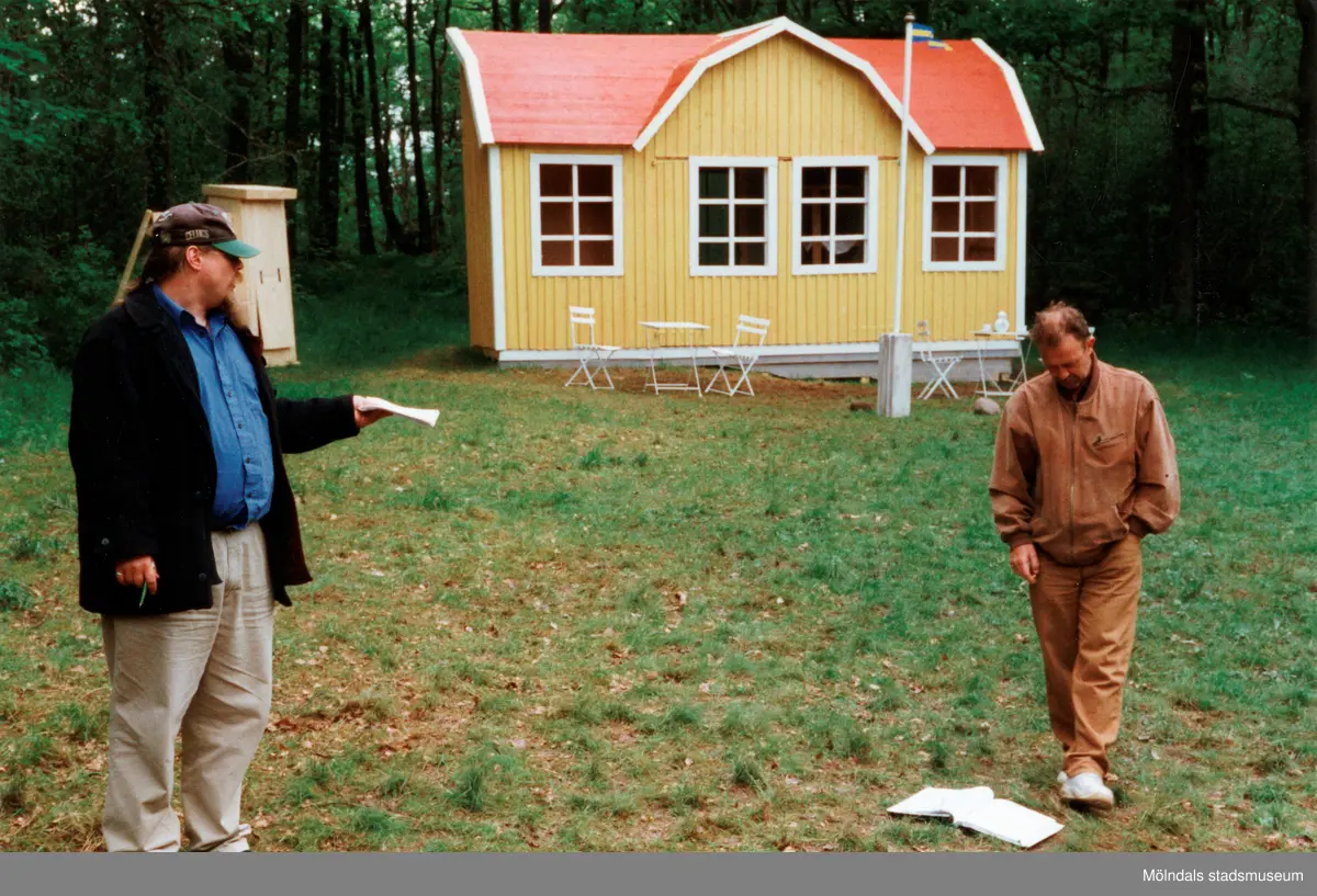 Sommarspelet/barnteaterföreställningen "Rasmus på luffen" 1999 vid Byxorna i Gunneboskogen (korsningen Christina Halls väg/John Halls väg). Två män läser manus, ståendes på en gräsmatta. Bakom dem ses ett gult litet hus.