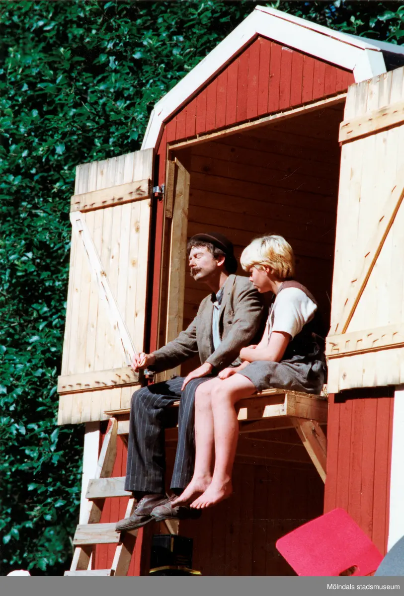Sommarspelet/barnteaterföreställningen "Rasmus på luffen" 1999 vid Byxorna i Gunneboskogen (korsningen Christina Halls väg/John Halls väg). En vuxen och en pojke sitter i öppningen till en mindre byggnad.