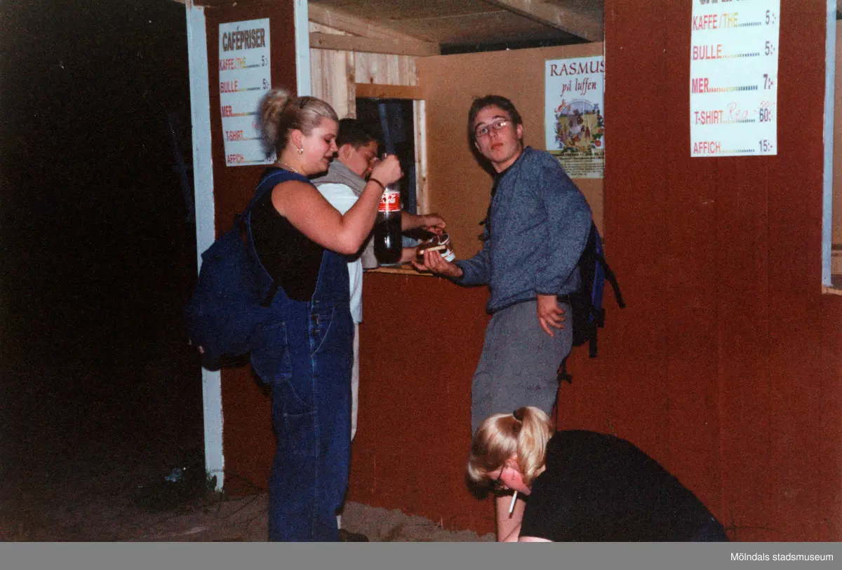 Sommarspelet/barnteaterföreställningen "Rasmus på luffen" 1999 vid Byxorna i Gunneboskogen (korsningen Christina Halls väg/John Halls väg). Tre personer (publik) står framför en kiosk. I kiosken står en man och häller upp något.