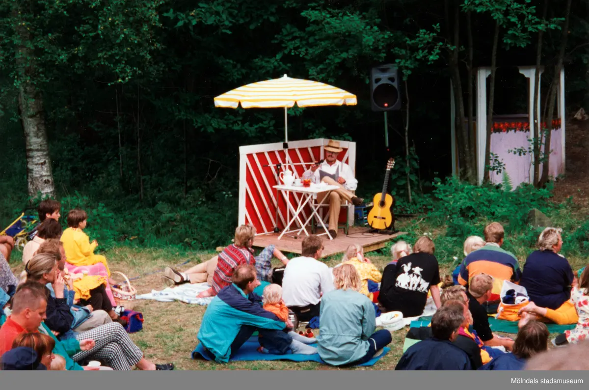 Sommarspelet/barnteaterföreställningen "Nalle Puh" 1998 vid Byxorna i Gunneboskogen (korsningen Christina Halls väg/John Halls väg). En manlig skådespelare sitter i en solstol och talar i en mikrofon. Framför honom finns ett fikabord och en parasoll. Publiken sitter väldigt nära och tittar på.