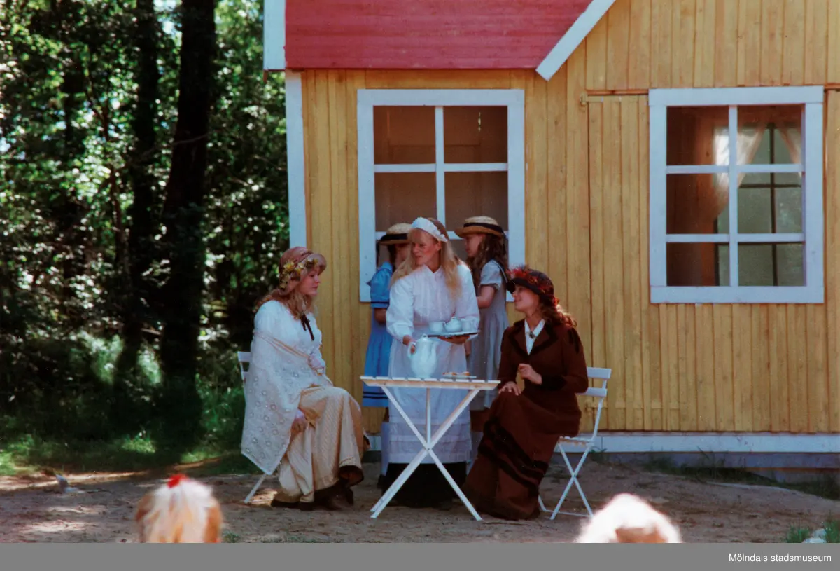 Sommarspelet/barnteaterföreställningen "Rasmus på luffen" 1999 vid Byxorna i Gunneboskogen (korsningen Christina Halls väg/John Halls väg). Föreställningen pågår och publiken ser på. Man ser två kvinnor som sitter vid ett kafé-bord framför ett gult litet hus. En kvinna serverar dem och i bakgrunden står två ungdomar.