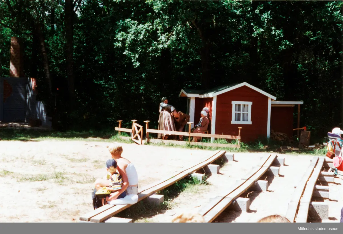 Sommarspelet/barnteaterföreställningen "Rasmus på luffen" 1999 vid Byxorna i Gunneboskogen (korsningen Christina Halls väg/John Halls väg). Främst ses några personer som har satt sig på bänkarna i väntan på att föreställningen ska börja. Skådespelarna står framför ett litet hus i bakgrunden.