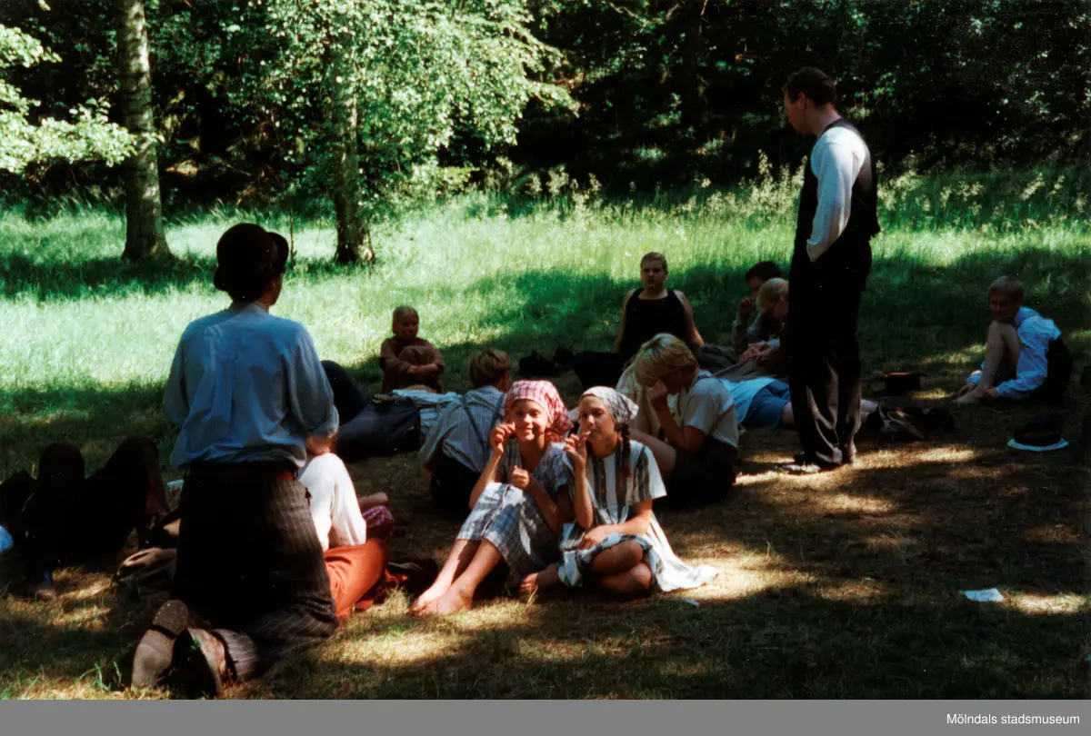 Sommarspelet/barnteaterföreställningen "Rasmus på luffen" 1999 vid Byxorna i Gunneboskogen (korsningen Christina Halls väg/John Halls väg). Flertalet deltagare i föreställningen har paus och sitter på gräsmattan under en stort träd som skuggar dem.
