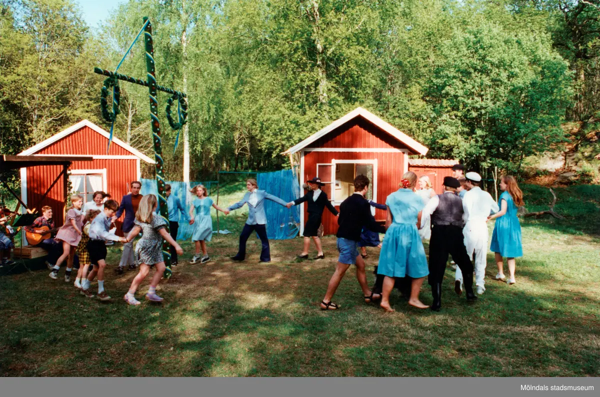 Sommarspelen/barnteaterföreställningen "Tjorven på Saltkråkan" 1996 vid Byxorna i Gunneboskogen. Barn och vuxna dansar runt en midsommarstång. Till vänster ses ett par musiker som spelar på instrument. I bakgrunden ses två små röda stugor som står framför flertalet träd. Relaterade motiv: 2024_0525 - 0533.