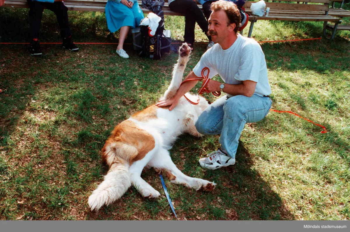 Sommarspelen/barnteaterföreställningen "Tjorven på Saltkråkan" 1996 vid Byxorna i Gunneboskogen. Janne Sandberg kliar en stor hund som ligger på gräset och njuter. Hunden spelar "Båtsman" i föreställningen. Relaterade motiv: 2024_0525 - 0533.