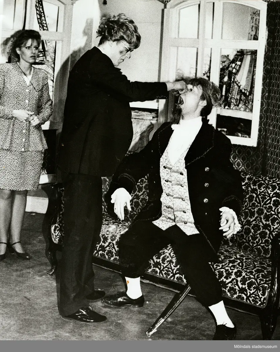 Teaterföreställning i Nya Teaterhuset, okänt årtal. Tre personer agerar på scenen.