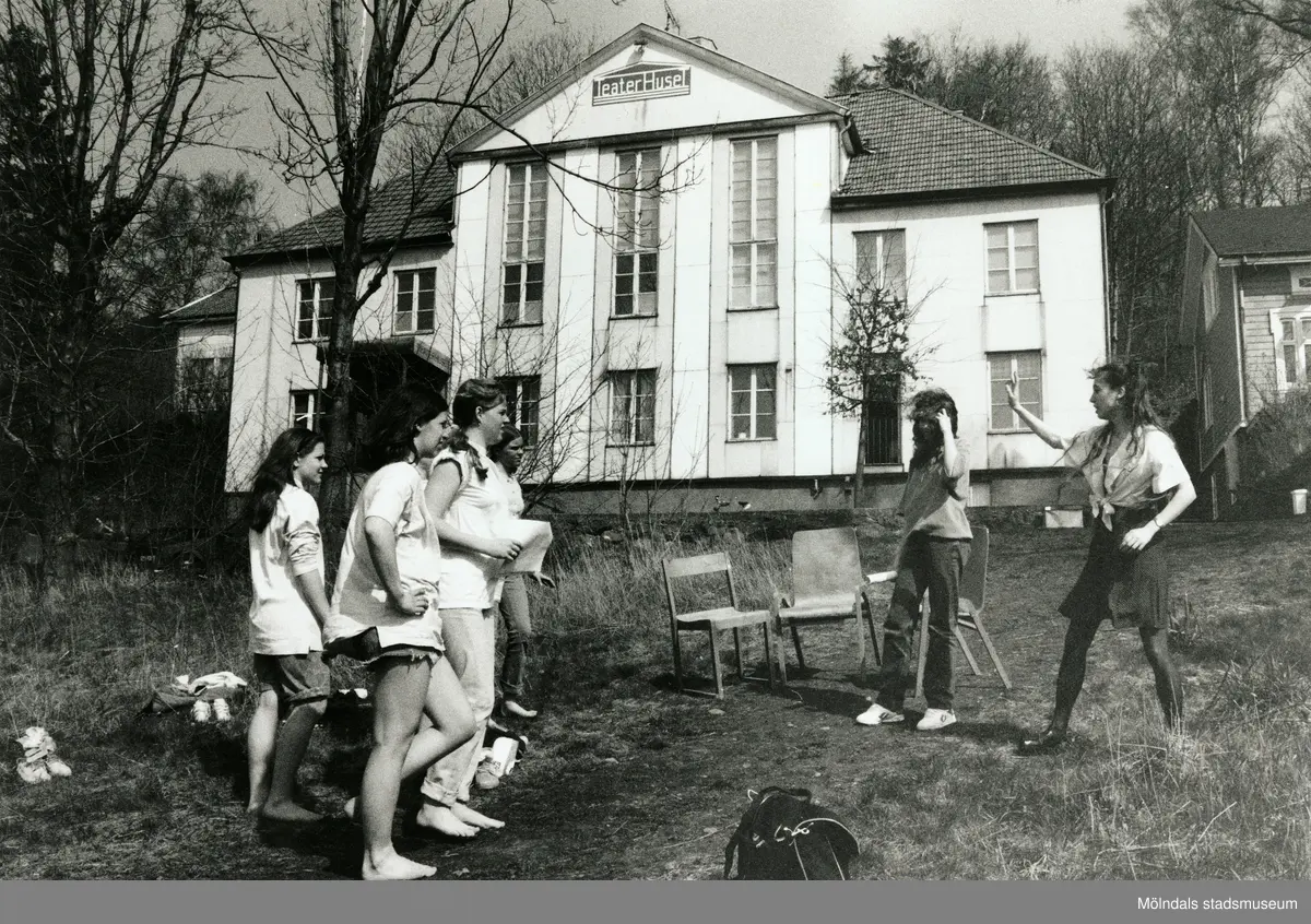 Sex personer står på gräsmattan utanför gamla Teaterhuset (före detta Missionskyrkan), okänt årtal.