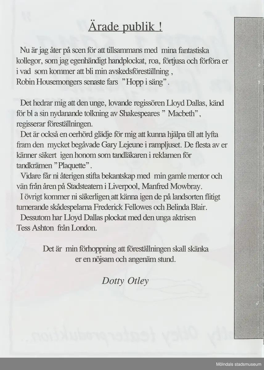 Text ur programhäftet "hopp i säng", okänt årtal. Se bild 2024_0504 som är programmets framsida.