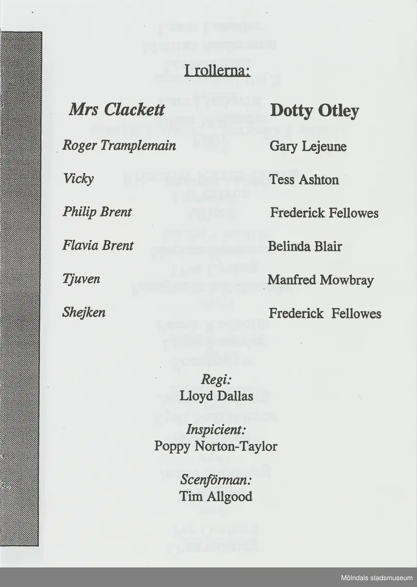 Medverkande i farsen, från programhäftet "Hopp i säng", okänt årtal. Se bild 2024_0504 som är programmets framsida.